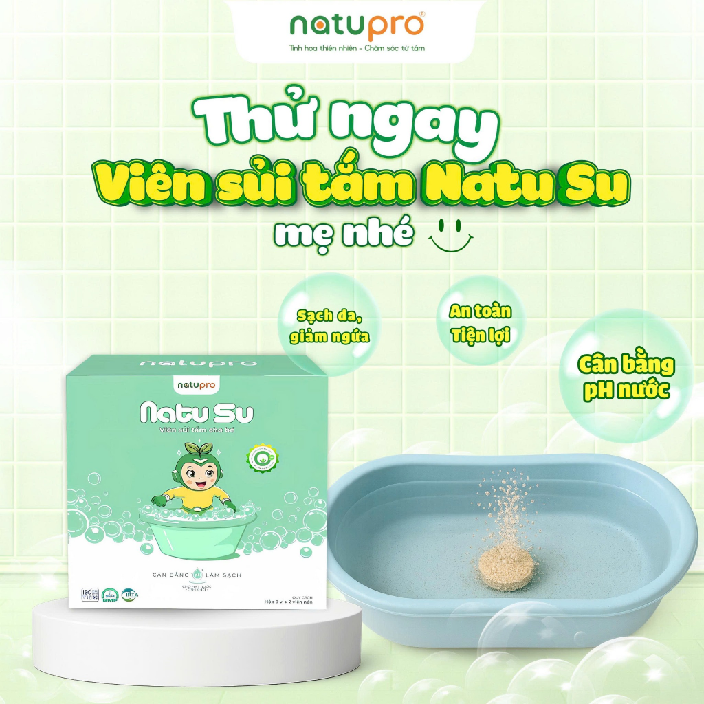 Natu Su là viên sủi tắm thảo dược được phát triển từ đề tài nghiên cứu của Viện Tuệ Tĩnh, dành riêng cho trẻ sơ sinh và trẻ nhỏ. Khi hòa tan trong nước ấm, viên sủi tạo môi trường pH lý tưởng, giúp làm sạch dịu nhẹ mà không cần tráng lại.